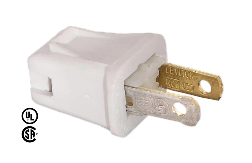 Leviton Brand polarized attachment caps. The 1-2-3 cap. Positive contact between cord & brass blades. For SPT-1 size cord only. U.L., CSA