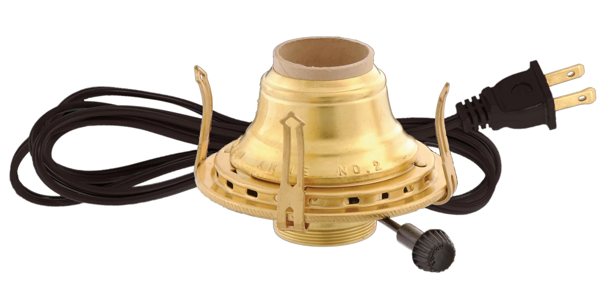 No. 2 Queen Anne Electrified Burner. Solid brass burner wired with U.L. listed parts & best quality 6 ft. lamp cord. Accepts a 3" base chimney.